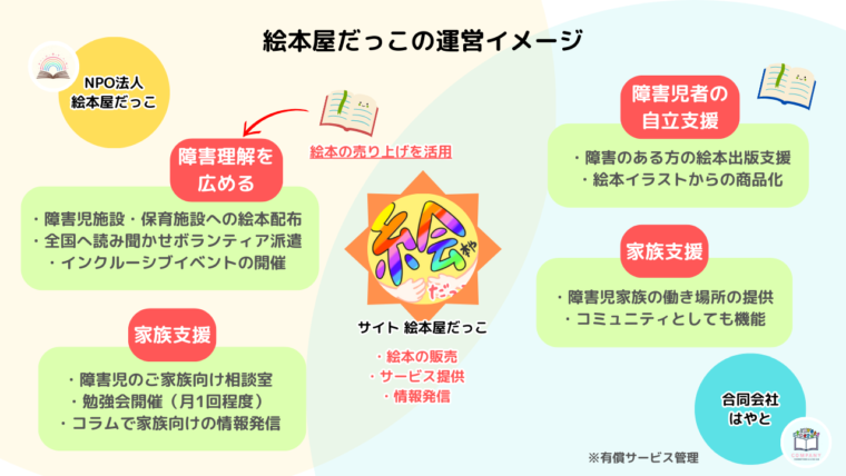 絵本屋だっこでは、「NPO法人絵本屋だっこ」と「合同会社はやと」を管理法人として動かしつつ、法人形態にとらわれない取り組みをしていきたいと考えています。